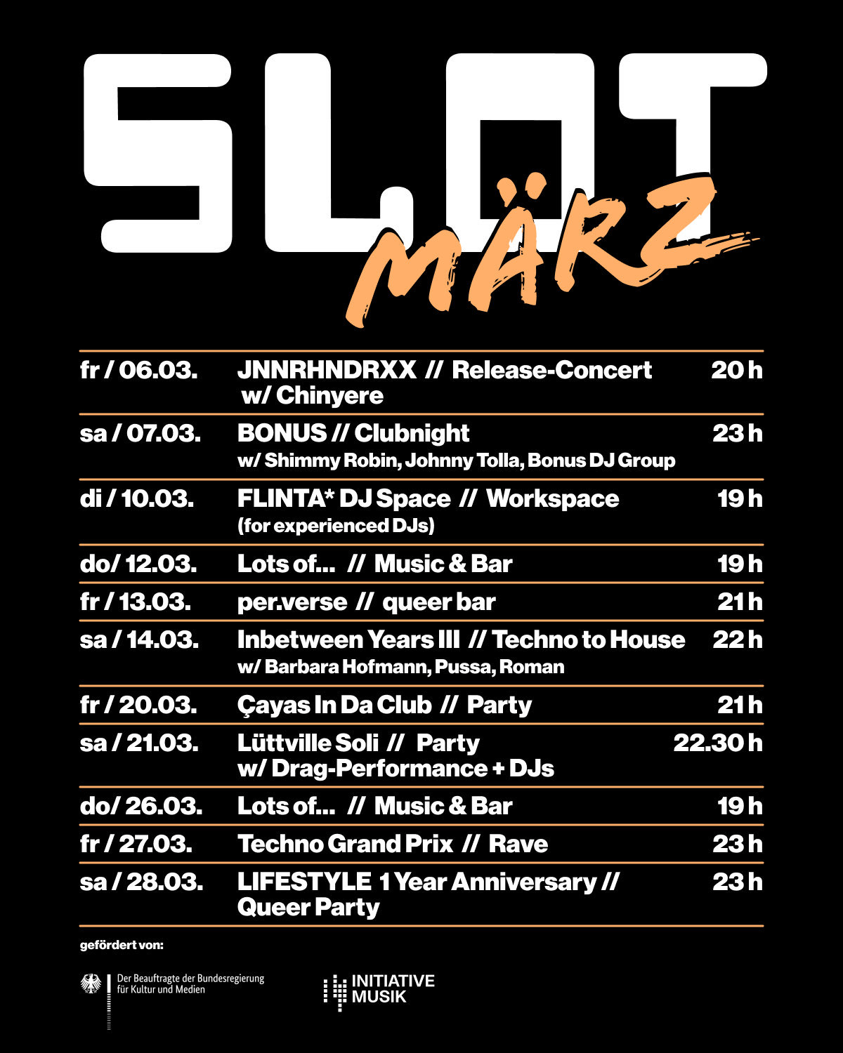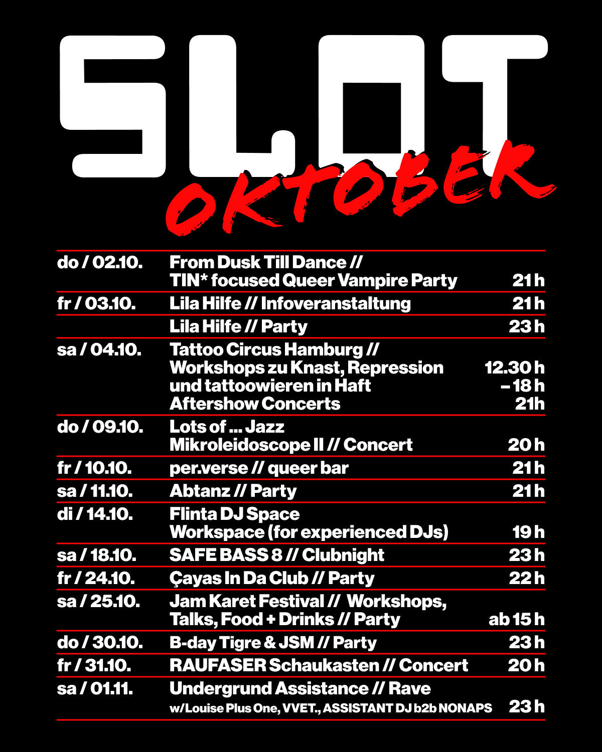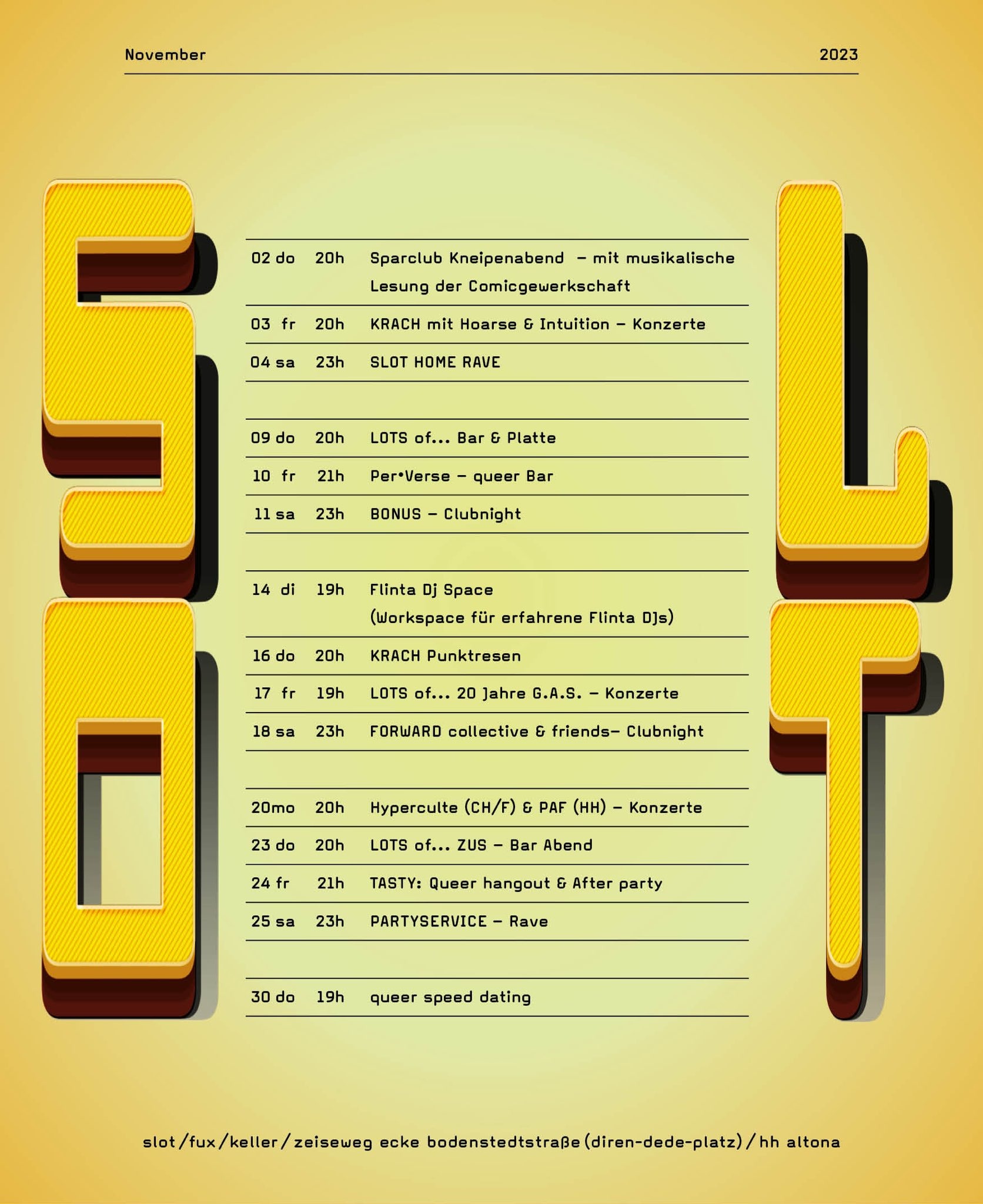 SLOT is a collectively operated, non-profit space for parties & concerts, debates and exhibitions – all incoming money in turn goes out to support political/cultural projects, initiatives and struggles. Furthermore, SLOT provides space for DIY activities and urban culture. We need your solidarity to save our practices & our space of solidarity for the time ahead.
